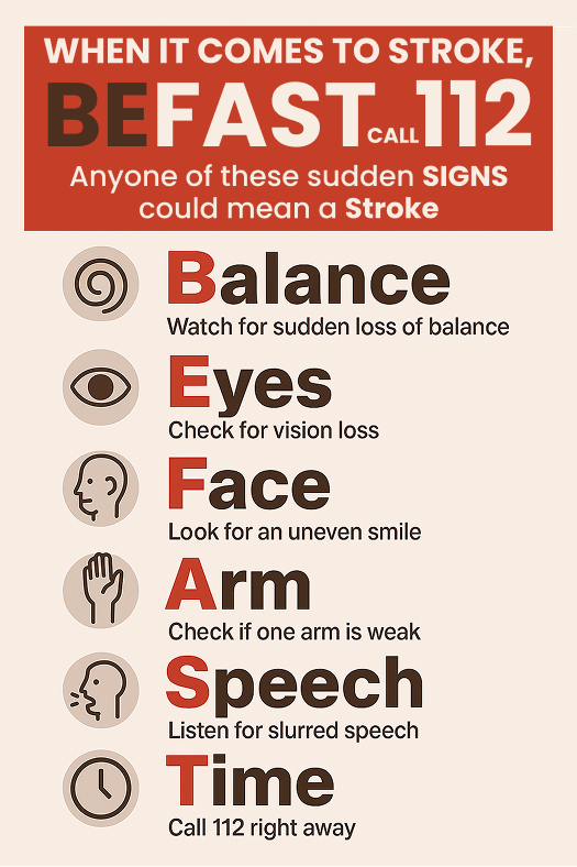 When it comes to stroke, every second counts. The BE FAST acronym helps quickly identify the warning signs: Balance issues, Eye changes, Face drooping, Arm weakness, Speech difficulties, and Time to call emergency services (112). Immediate action can save lives and reduce the risk of long-term disability.