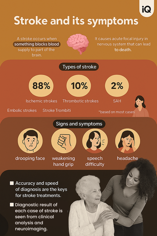 Stroke occurs when the blood flow to a part of the brain is interrupted, leading to potential brain damage or death. Most strokes are ischemic, with thrombotic and hemorrhagic types also occurring. Recognizing early signs like facial drooping, a weak hand grip, speech issues, and headaches is crucial. Prompt and accurate diagnosis using clinical evaluations and neuroimaging can significantly improve treatment outcomes.
