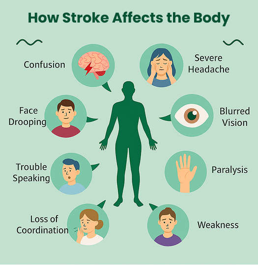A stroke can have a wide-ranging impact on the body, often striking suddenly and affecting different physical and mental functions. As shown in the image, common symptoms include confusion, severe headache, face drooping, blurred vision, trouble speaking, paralysis, weakness, and loss of coordination. Recognizing these signs early is crucial for timely medical intervention and better recovery outcomes.