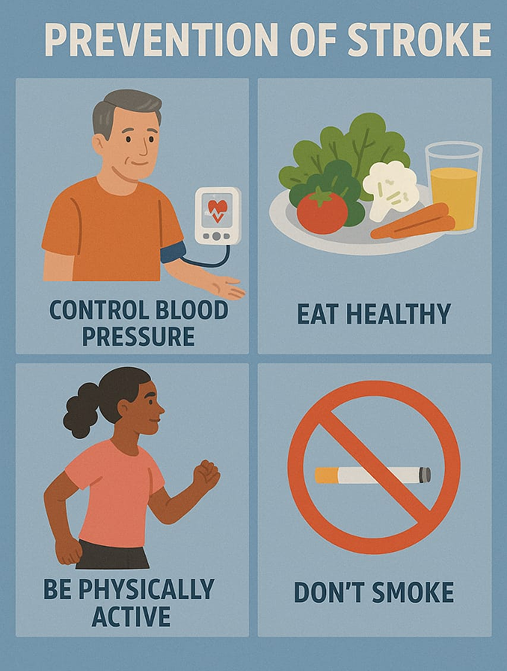 Taking steps to prevent a stroke is easier than you might think. This image highlights key lifestyle habits that reduce stroke risk: managing blood pressure, eating a healthy diet, staying physically active, and avoiding smoking. Making these small but powerful changes can greatly improve your overall health and help keep your brain and body protected.